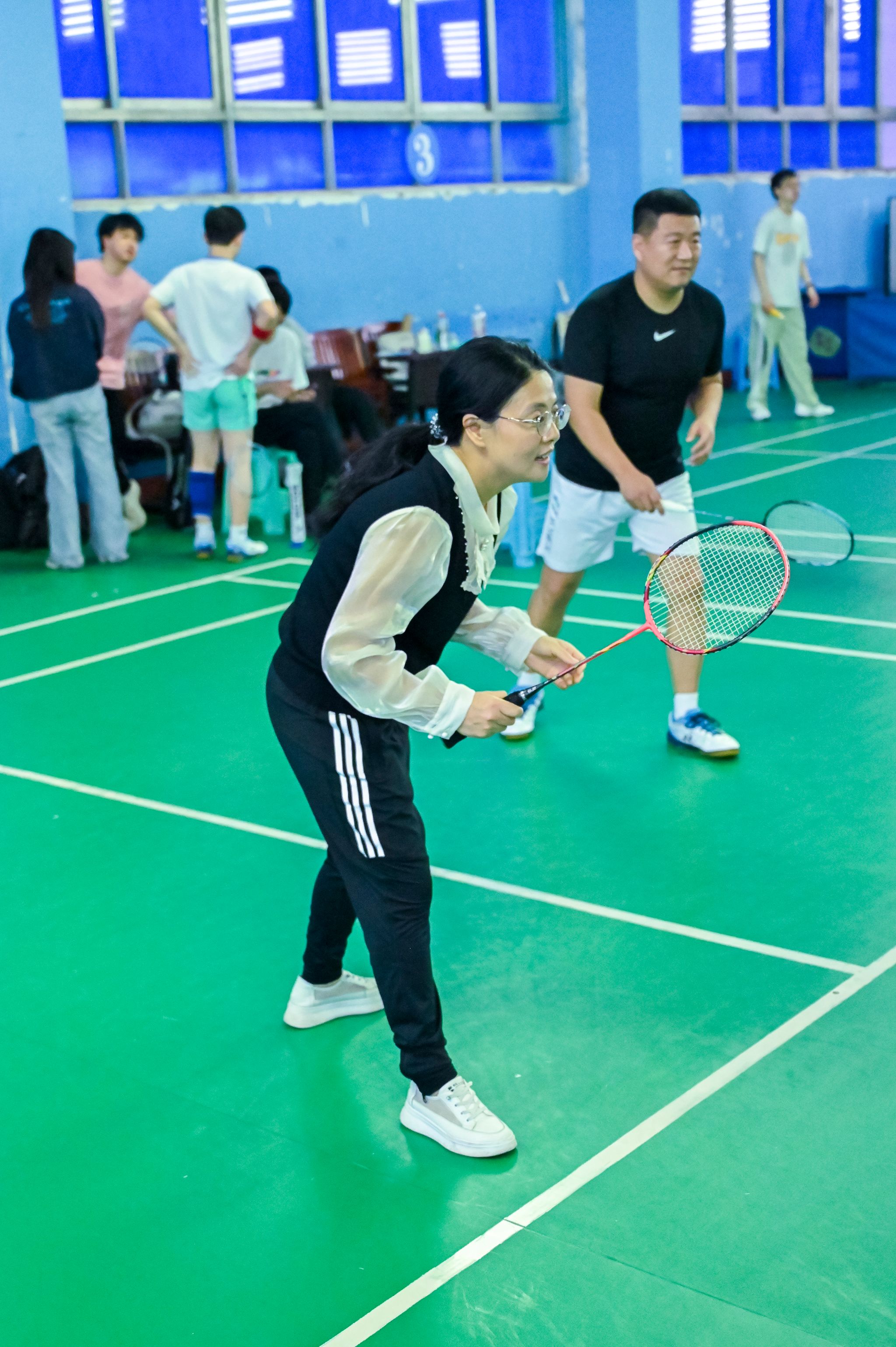 比赛现场,白色的羽毛球在空中穿梭,划出一道道优美的弧线,清脆的击球声与观众热烈的喝彩声交织在一起。老师们展现出了精湛的球技,时而以精准的高远球掌控全场,时而用巧妙的平抽球打乱对手节奏。每一次惊险的鱼跃救球都引发阵阵惊呼,每一记精妙的网前小球都赢得满堂喝彩。场边观众的热情更是将比赛推向高潮,“加油!”“好球!”的呐喊声此起彼伏,热烈的掌声与欢呼让整个场馆洋溢着蓬勃的朝气与活力。