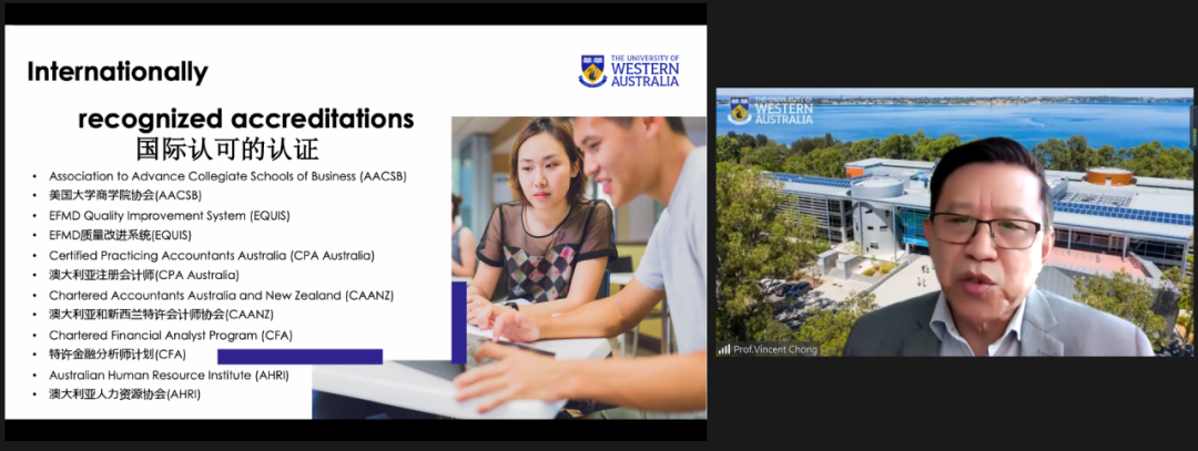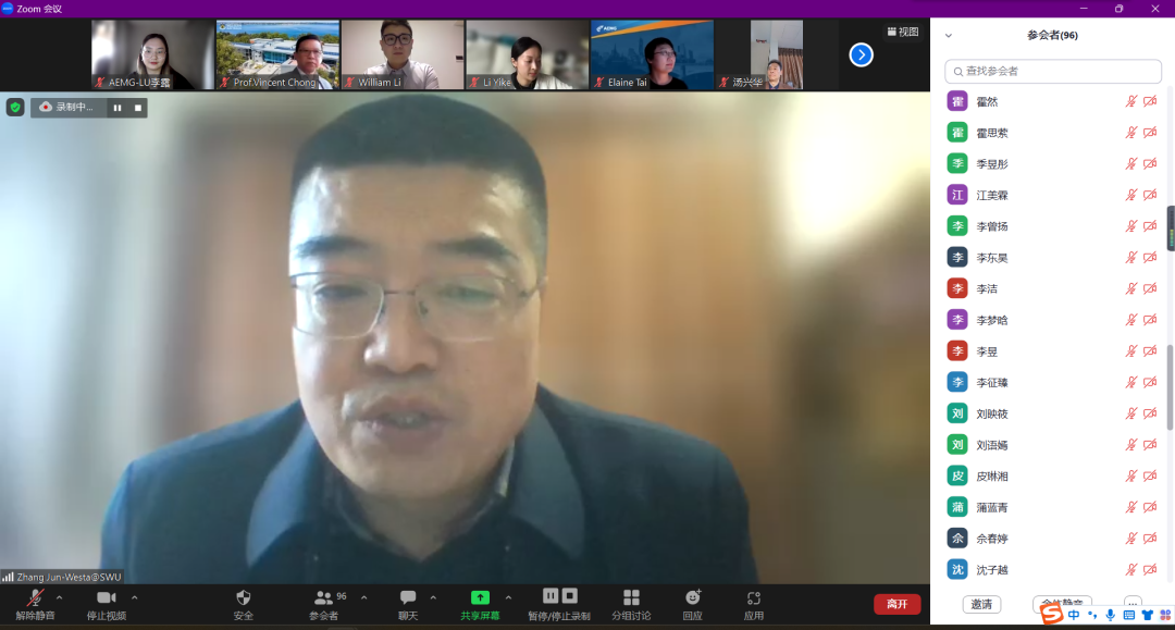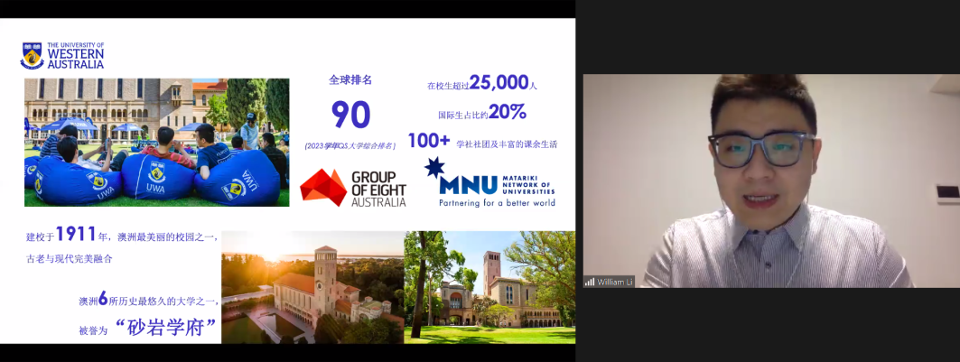 11月25日下午,免费看球 2020级3+2项目出国宣讲会在线上顺利举行。本次活动邀请了西澳大学商免费看球 会计与金融学Vincent Chong教授、分子生物科学免费看球 高级讲师Alyssa Van Dreumel博士、西澳大学华南区域负责人William Li先生,免费看球 副院长张俊、国际项目管理办公室以及2020级经济学、生物技术专业全体同学及部分家长参会。