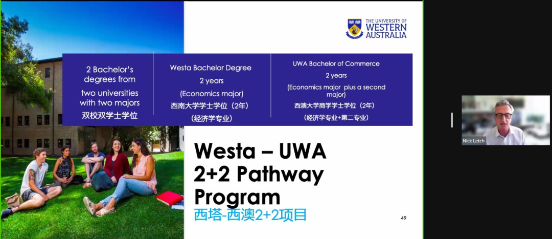 西澳大学Nick Letch副教授和Alyssa Van Dreumel博士分别解读了经济学、生物技术专业2+2培养模式。他们介绍了珀斯城市环境、学校国际声誉、全球合作、培养模式、授课方式、学生活动等内容,并谈到西澳大学拥有灵活的选课机制,同时西澳大学与当地政府、企业间的密切合作,能够为西澳学子提供丰富实践机会的优势。