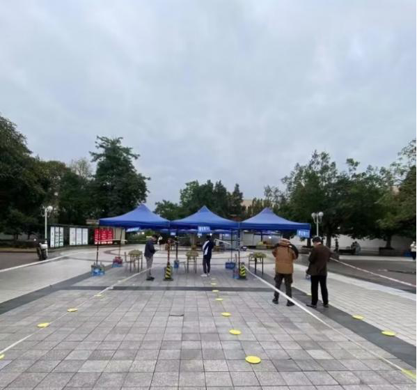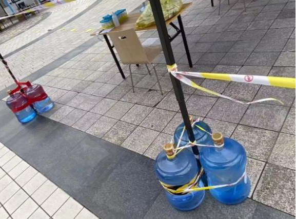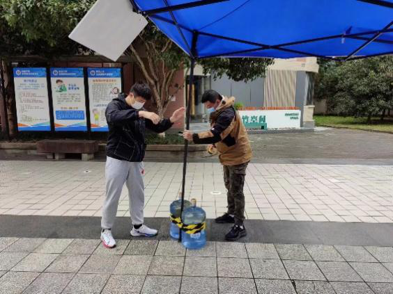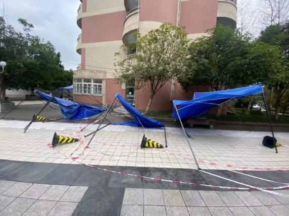 11月11日晚至12日早上,一场暴雨将竹园二区核酸采样点几乎所有的帐篷刮倒在地,一部分甚至损坏不能使用。据他回忆,当时风太大,帐篷根本稳定不住,在免费看球 党委滕超副书记的带领下,他们就地取材,搬了20余桶桶装水固定帐篷,并配合剪刀、胶带、螺丝刀等工具……最终在当前核酸采样时间前成功修复核酸采样点。