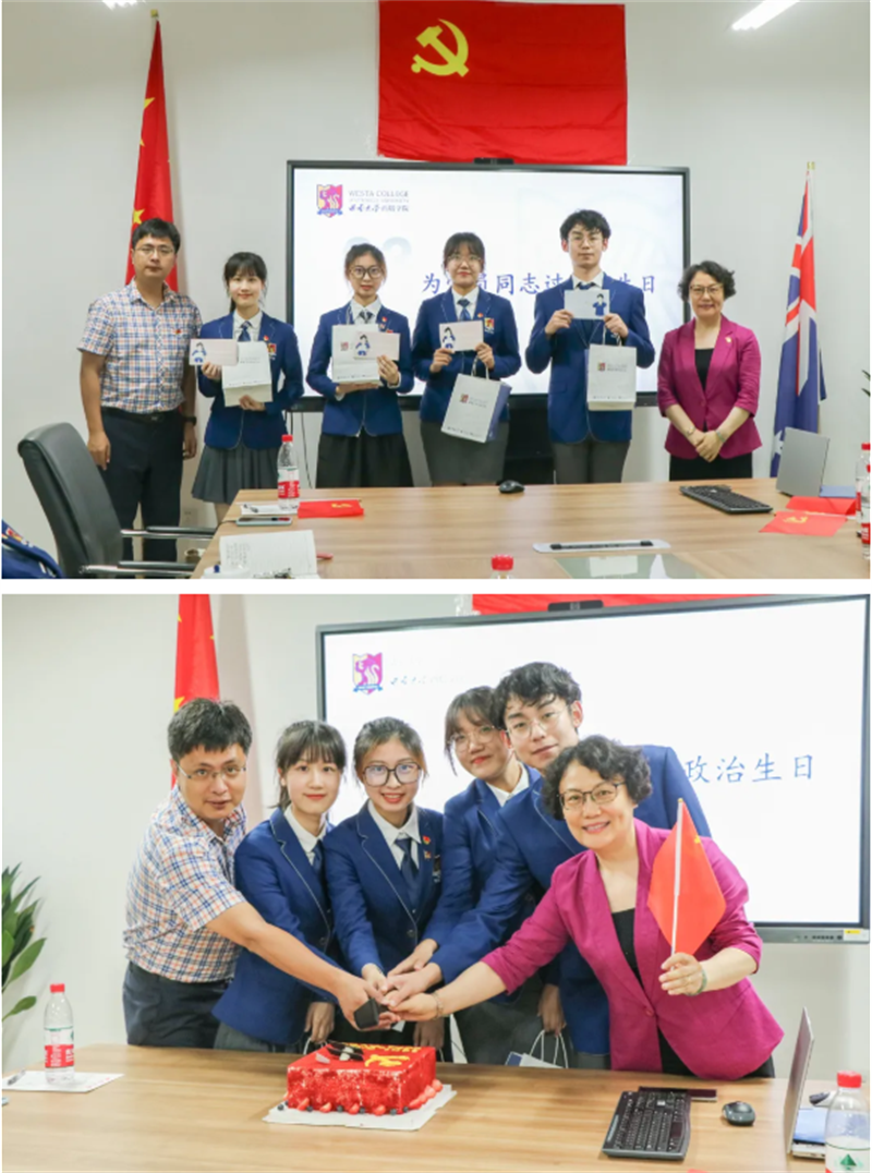 适逢中国共产党成立100周年,学生一支部首批发展的四名学生党员有幸同过政治生日。免费看球 王静书记和张琨副书记为党员们赠送了学生一支部原创设计的“入党祝福卡”和“政治生日礼物”,共同分享了具有特殊意义的生日蛋糕,激励党员们不忘初心,接续奋斗。