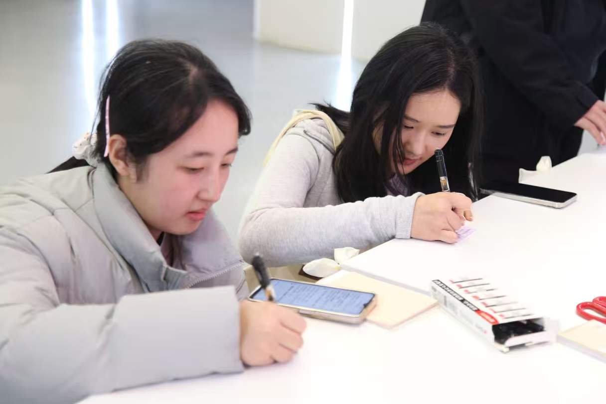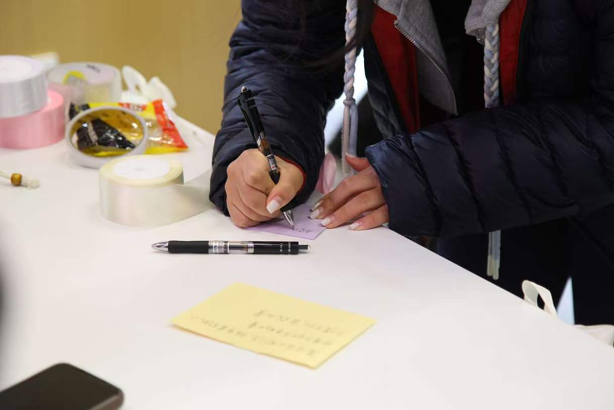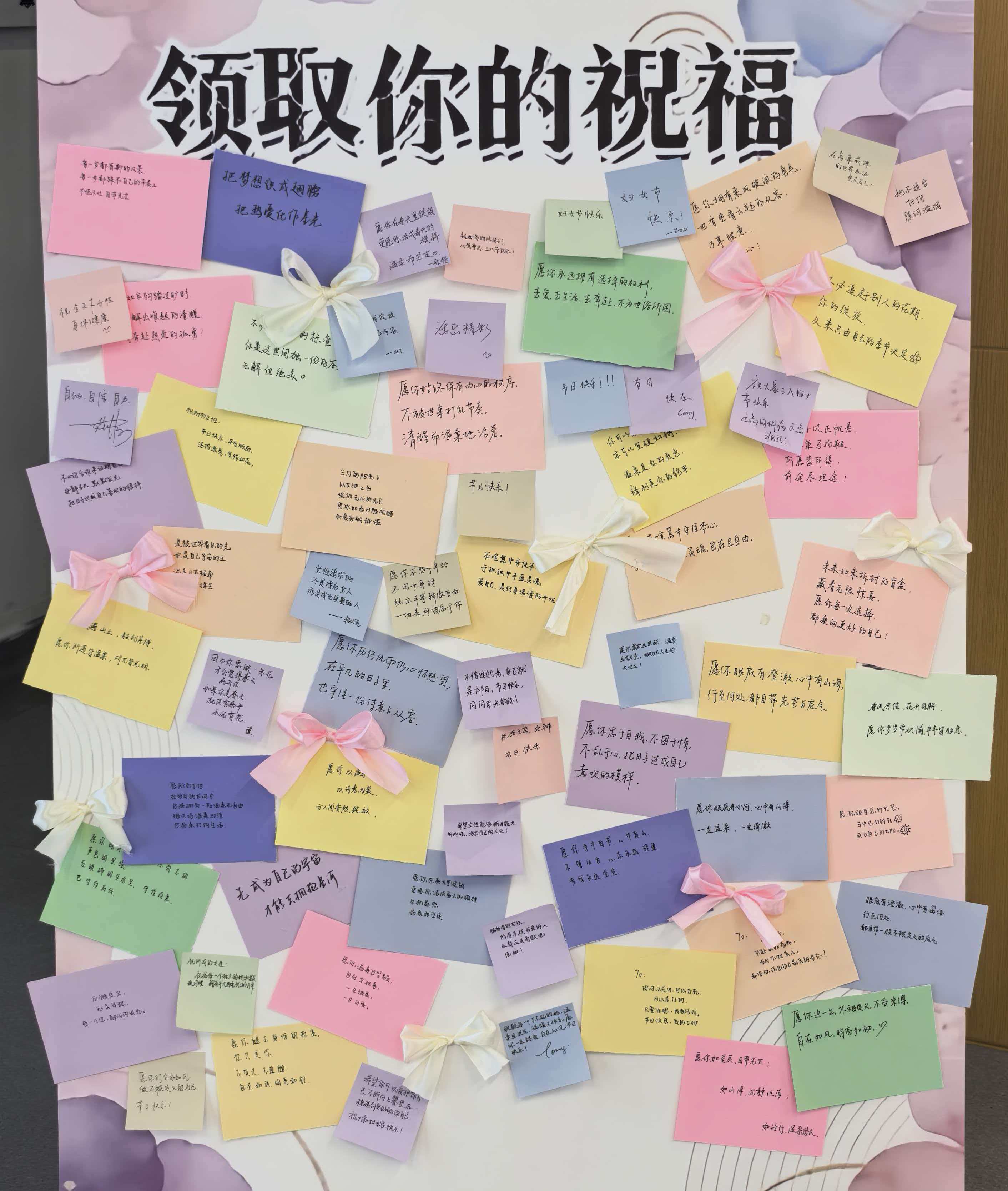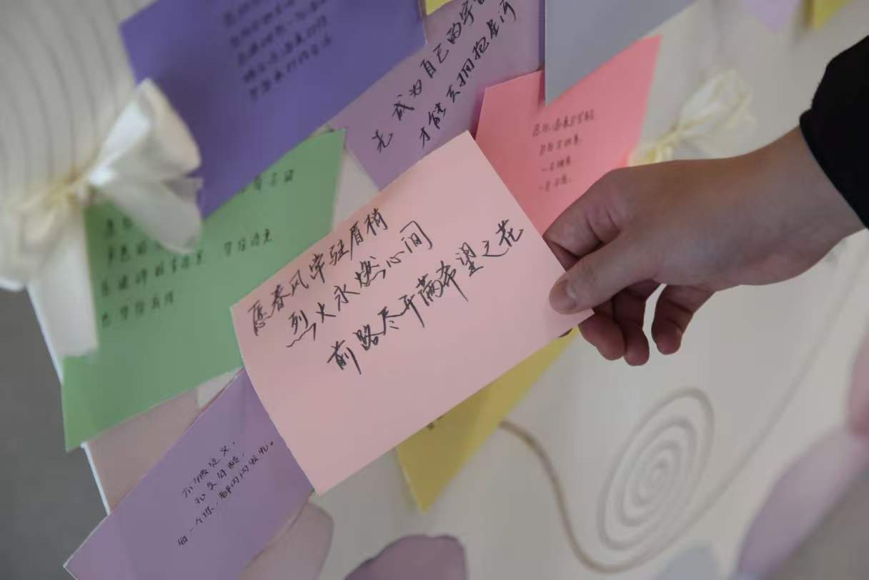 活动现场安静有序,唯有笔尖轻触纸张的沙沙声响。师生们拿起彩色便签,认真写下真挚话语:一句真诚祝福,赠予身边每一位重要的她。