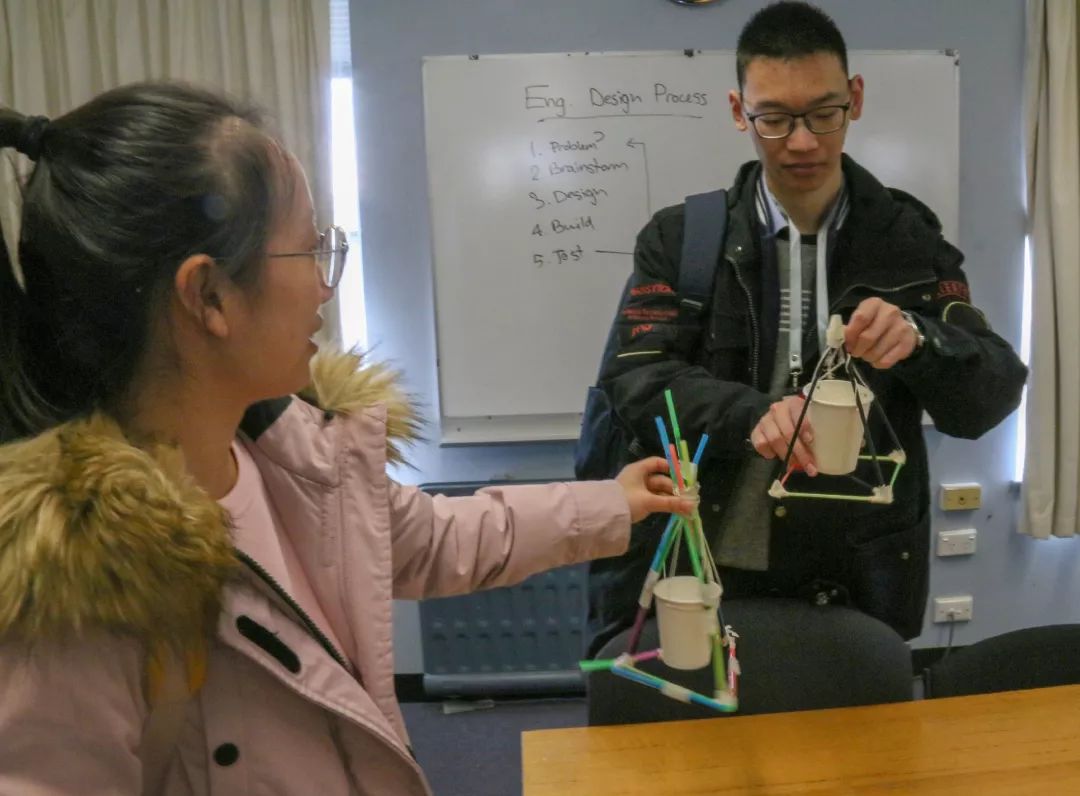 同学们分成五个小组,精力合作,经过一番“头脑风暴”,克服了重重困难,借助绳子、纸杯、吸管、细棒、胶带和裁剪工具,在20分钟内都成功做出了能够放置尽可能多数量弹珠的“承重塔”。