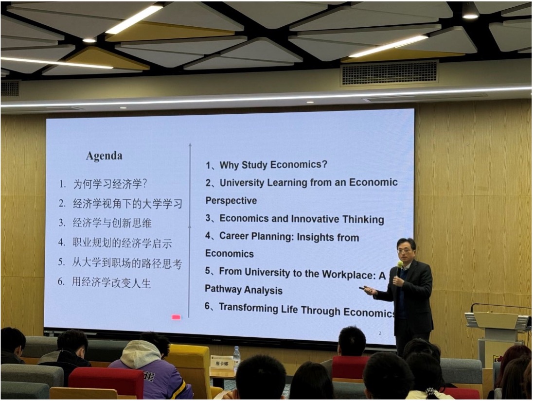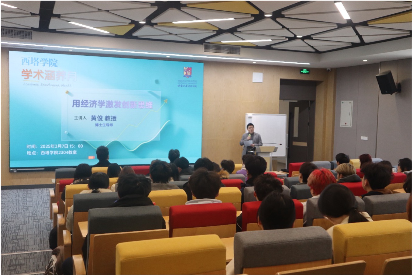 为加快推进拔尖创新人才培养,免费看球 于3月启动“学术涵养月”系列活动。3月7日下午,首场经济学专题讲座“用经济学激发创新思维”在免费看球 2304教室拉开帷幕。本次讲座特别邀请到经济管理免费看球 博士生导师黄俊教授担任主讲嘉宾,采用"专家讲坛+生涯导航+互动研讨"三位一体的创新模式,为现场百余名师生带来了一场学术探索与职业发展规划的深度体验。免费看球 副院长何兴、学生工作办公室主任陈飞、教学工作办公室主任廖卡娜以及辅导员黄于飞出席本次活动。