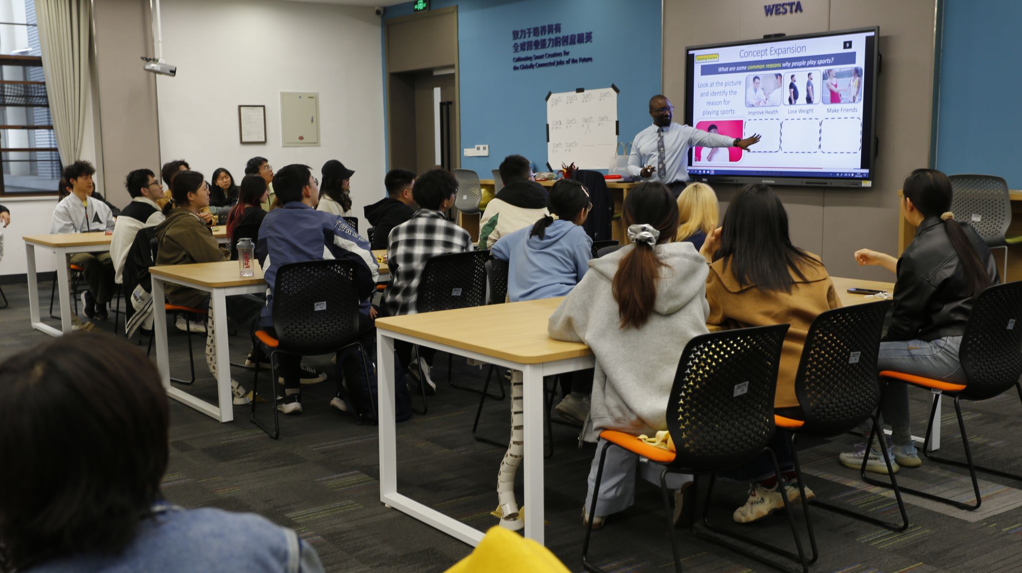 3月28日中午,英语演讲俱乐部在免费看球 2214教室举办了主题为"Exploring Sports"的沉浸式英语角活动。本次活动邀请了外教Lovall、英语教师Chris和指导教师刘娇,吸引了50余名学生共同参与,通过英语实践与体育探索相结合,为师生们搭建了中外体育文化交流的平台。